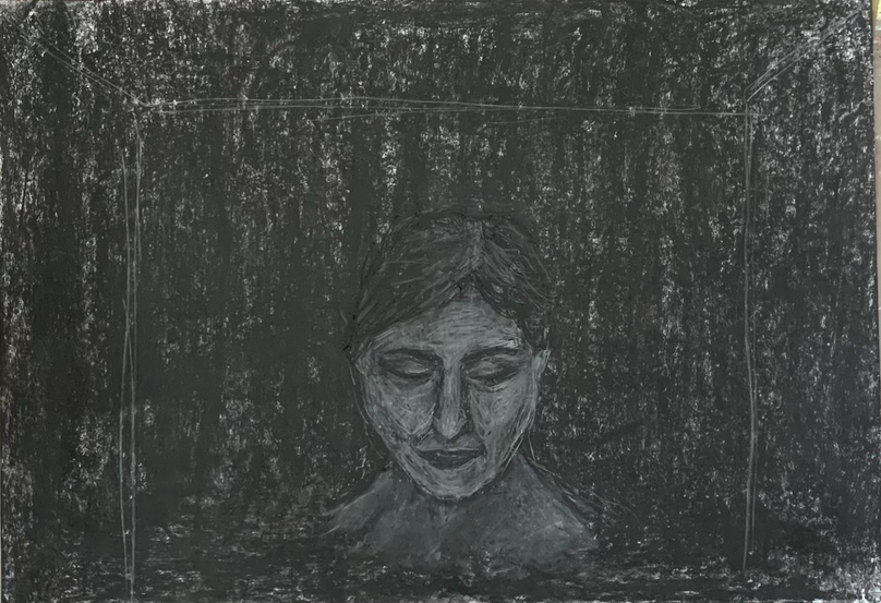 I was inspired by 'Breathe' by David Begley to make a face emerge from the darkness, as he does this with the condensation from another character's breath. I used an eraser and chalk and placed the face in a room that looks like it could be inside one of the buildings. The character looks sombre and contemplative and is ultimately alone in a dark room, despite living in such a busy world. I added bars that look like those of a prison cell to create a sense of entrapment and a separation between the inside and outside world. I wanted to create a sense of claustrophobia and explore the irony of loneliness when we have such a connected world.