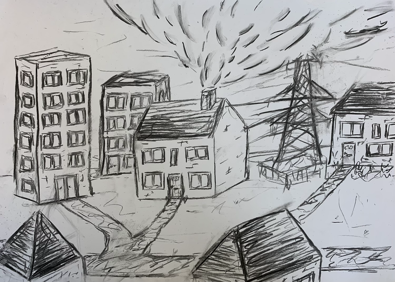 I started by building up a drawing of a traditional, average-looking house that is recognisable to most people and seems idyllic in the peaceful setting. I then slowly added more houses and buildings into the surroundings to show the world becoming busy and overpopulated. It gets to the point where the original house looks suffocated and overwhelmed- it was once the focus but is now lost. This links to the idea that people have become disconnected from their roots because we are all overexposed to the wider world. The drawing becomes so crowded and the sky so polluted that the whole image becomes black.
