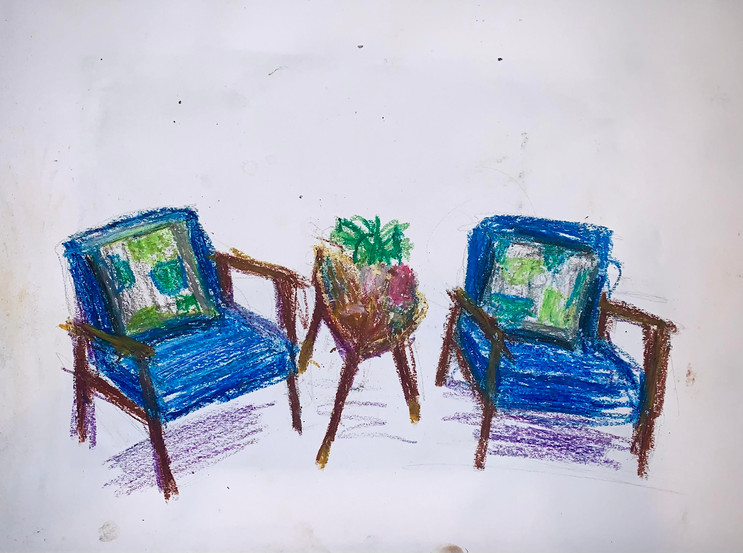 Finally, I continued my work in the domestic location and thought about the secrets that might be told in private locations. I made an oil pastel study of 2 chairs and a table, which is a relatable set up for conversations. I then looked at the work of Ivana Carman (Carman, 2020), and was really interested in her painting of different rooms, especially with the different perspectives in the one image. I used soft pastels to draw my own living room, and used a different perspective for the dining room, which could be seen through the doors. This could have been more exaggerated, but I like how the whole drawing feels like a CCTV image. I might similar locations more often, because they give an insight into a personal space that is often concealed.