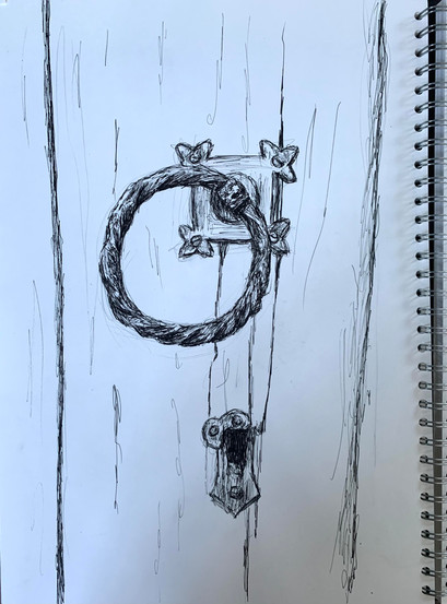 For further visual research, I used graphite and charcoal to make rubbings of the different textures of the church and graves. I then made a soft pastel drawing of the whole church, and was inspired by Lucinda Rogers [4] to be selective with colour. This allowed me to focus on the overall composition rather than small details. I went into more detail in creating a gouache painting of the church door. I included part of the ornate surround but wanted to focus on the entrance itself- from the eerie graveyard into the inviting church. I zoomed in further and drew the handle and lock using fineliner to explore the process of entering the building.