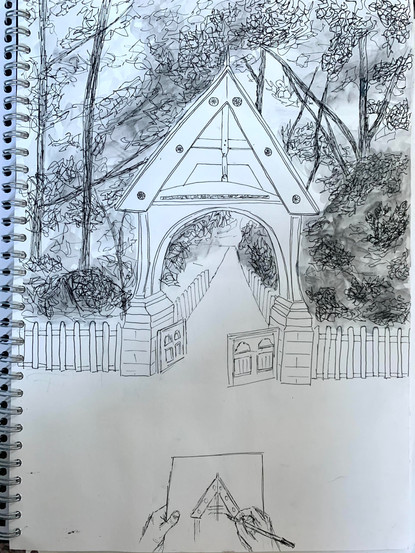 I used fineliner and gouache to draw the archway and was inspired by Brett Whiteley [1]. I kept most of the image simple, using carefully-chosen marks to create a divide between each side of the boundary. I was more expressive when drawing the trees because I wanted those to look busy and inviting. I also included myself drawing (as Whiteley does) because it looked more personal unplanned. I also made gouache studies of the leaf and pathway to document the journey into the graveyard. I used charcoal to draw the gate and handle, further showing the threshold. I also made studies of the surveillance signs using gouache and fineliner.
